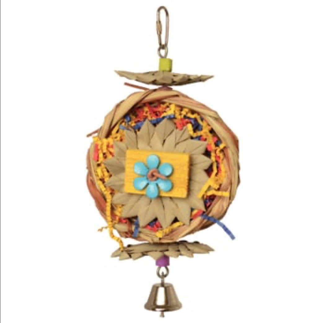 Woven palm flowers and seagrass bowl stuffed with colorful crinkle shred and decorated with leather strips, wood slats and beads.