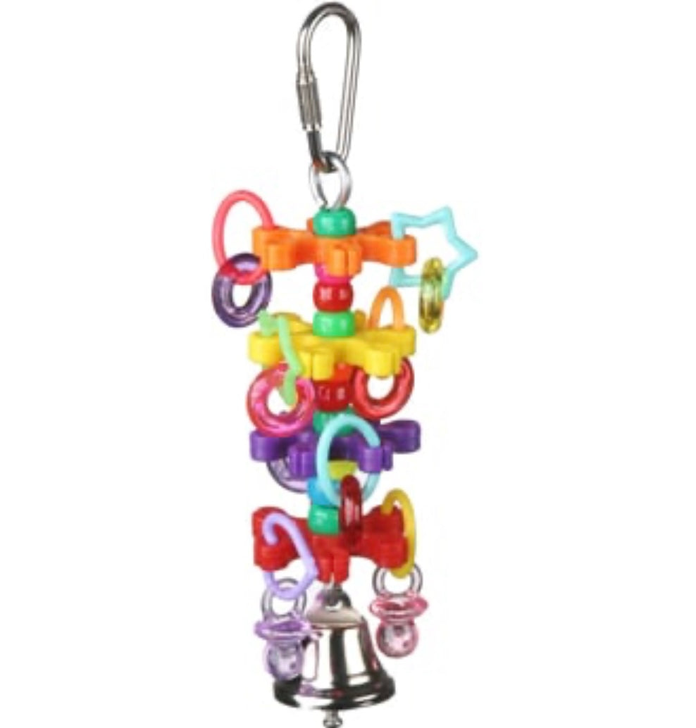 Three plastic wheels with a cascade of brightly colored geometric shapes, beads, rings and a shiny bell.