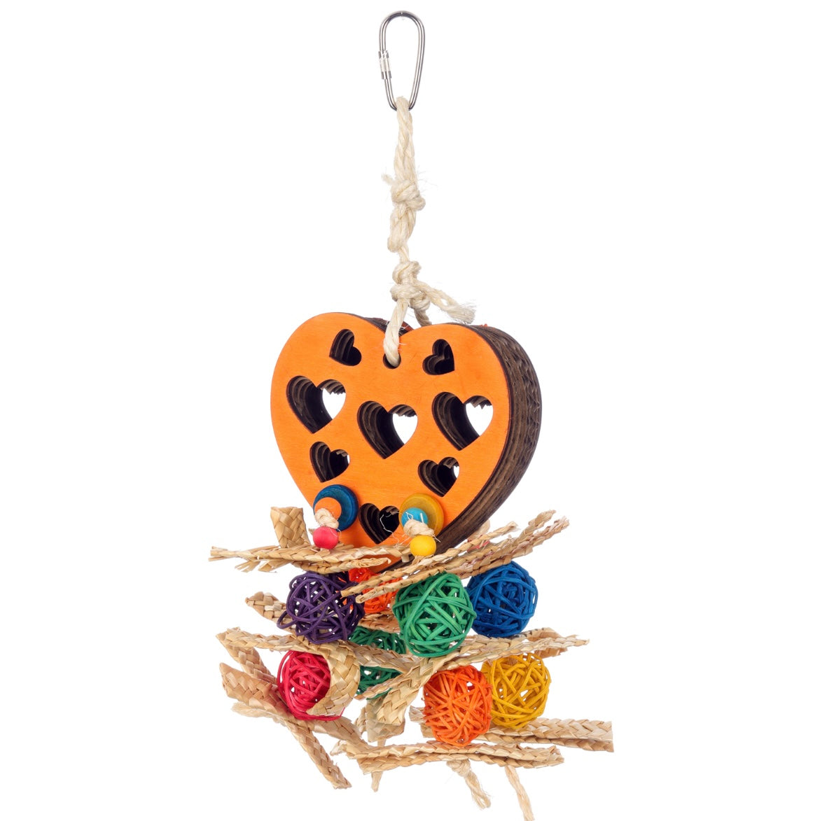 - DESIGN FEATURES – Adorable heart-shaped core consisting of cardboard sandwiched between two wooden outer layers with several heart-shaped cutouts perfect for inserting treats. The heart is adorned with colorful vineballs and woven palm strips to delight chewers. Easily attaches to the cage with a bird-safe pear link.
