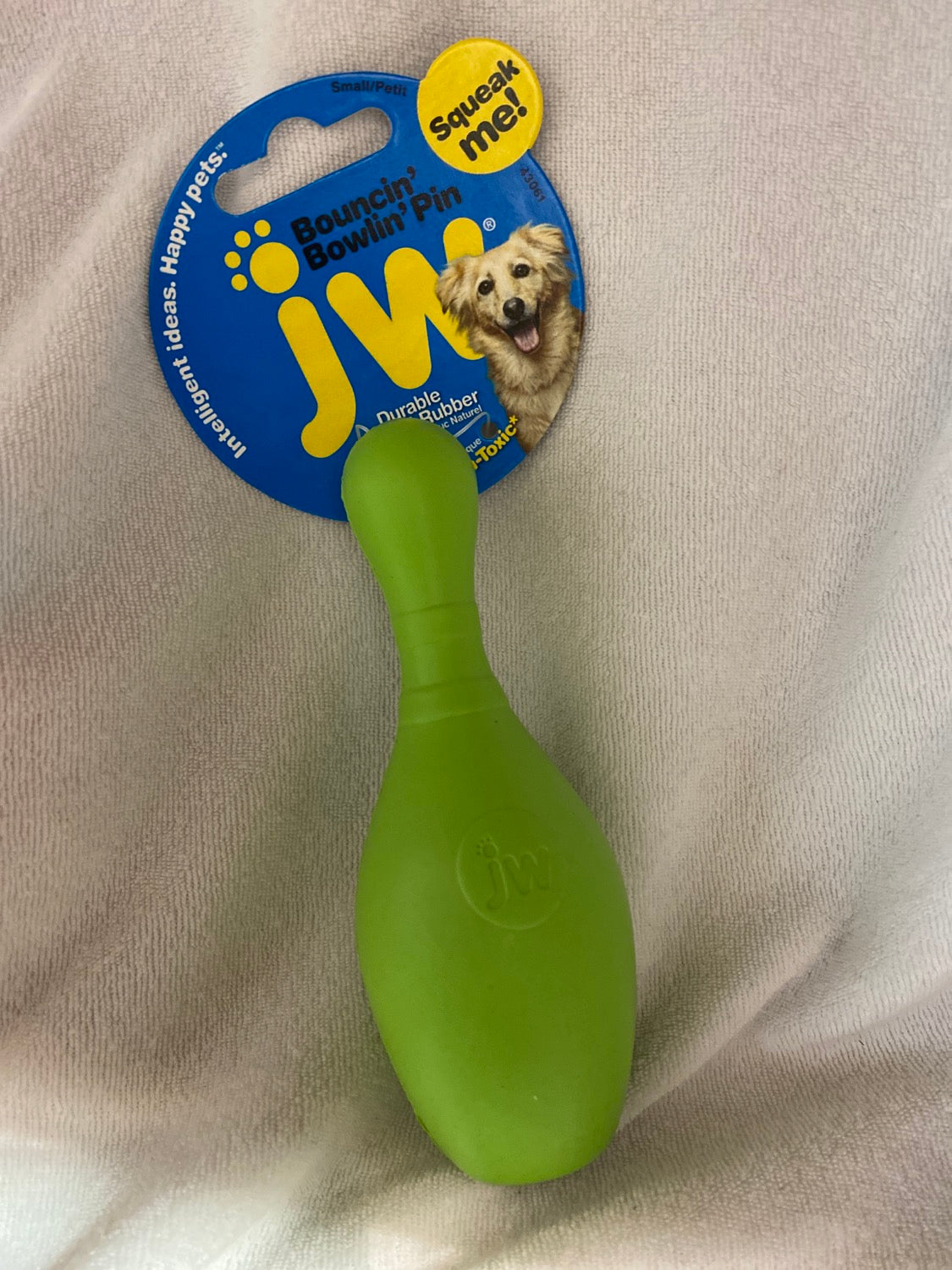 JW® Bouncin' Bowlin' Pin is an interactive rubber dog toy that squeaks. The Bouncin' Bowlin' Pin will provide fun and entertainment for your dog. Made of tough and durable rubber to withstand chewing and long-term play. Perfect for bouncing, flinging, and rolling and it squeaks! This familiar shape will be fun for both you and your dog. Great for dogs that love to chew and teething puppies. The bowling pin design fits easily into a dog's mouth for carrying. Easy to clean. Ready and waiting to be squeaked and played with, your dog is sure to STRIKE it big with these. Ships in assorted colors.