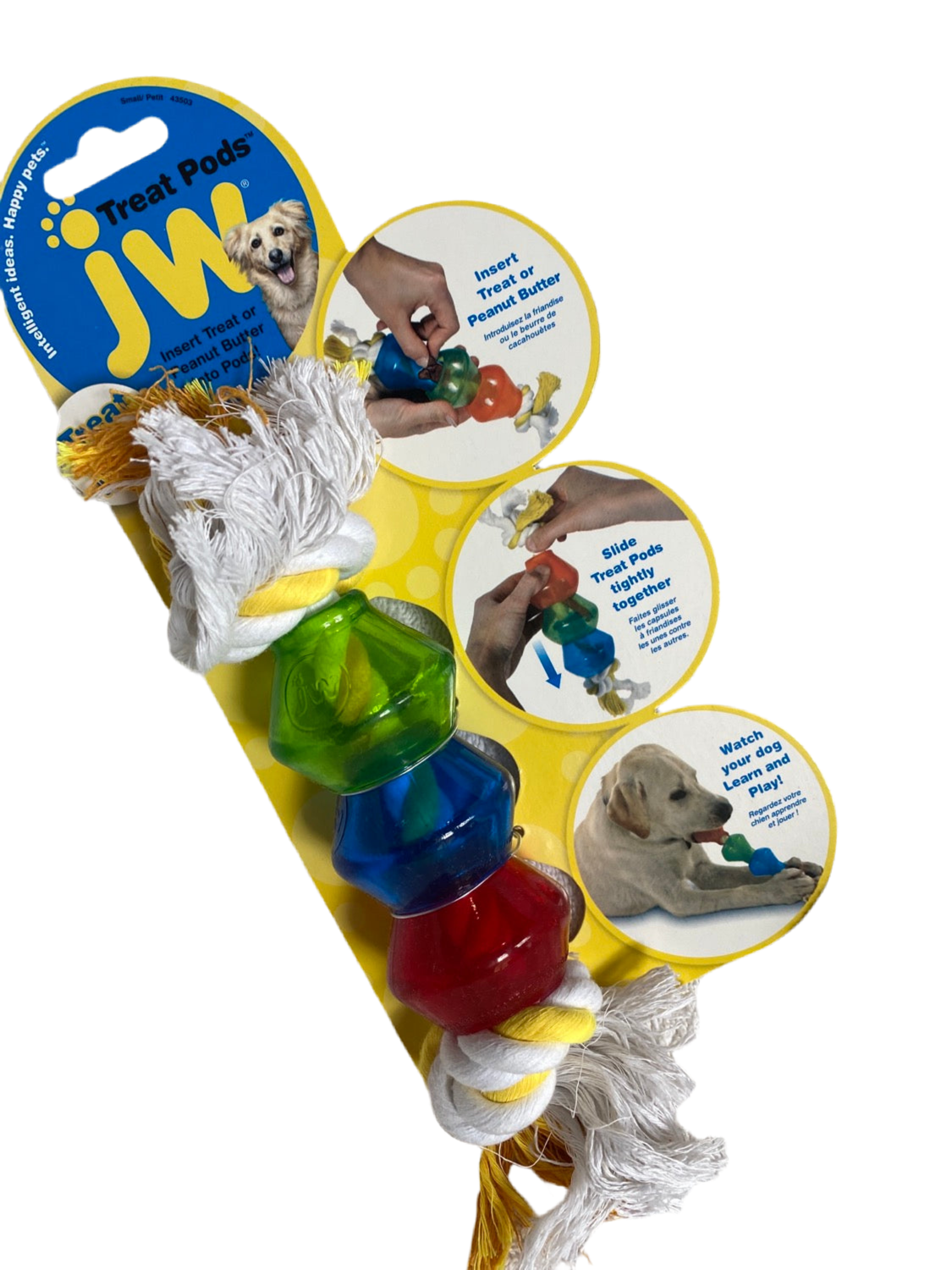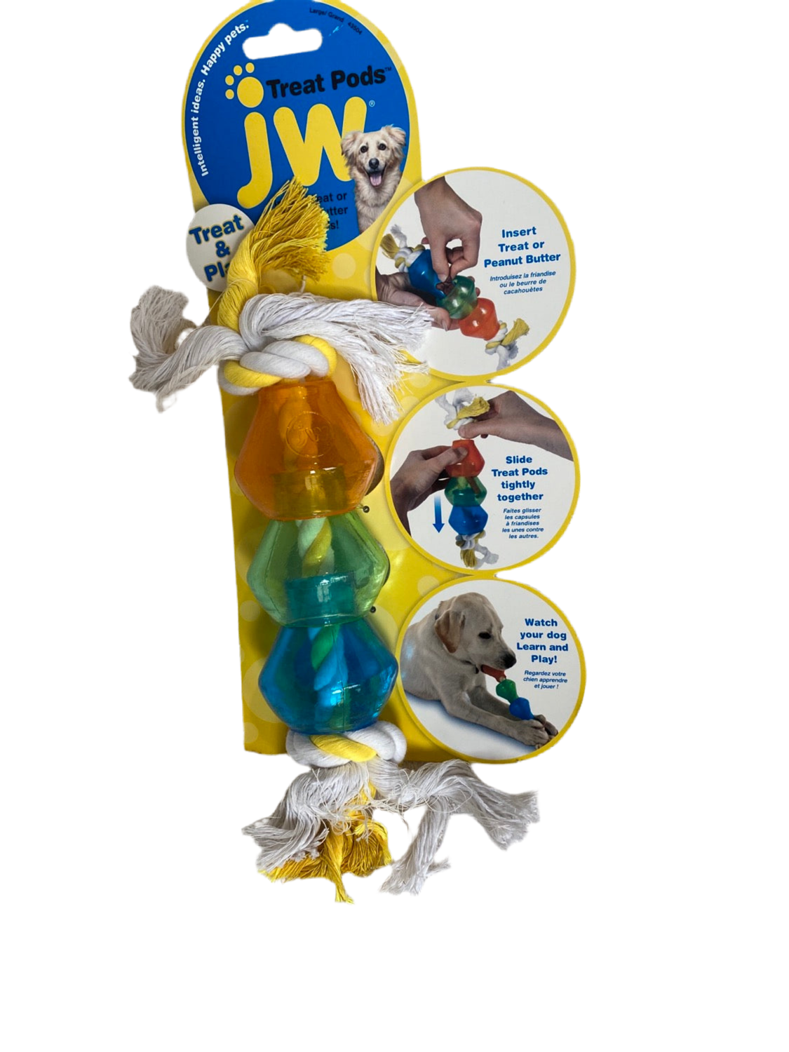 JW® Pet Dog Treat Pods are a truly unique dog treat dispensing toy that dogs instinctively respond to. Three durable TPR Pods are placed on a durable natural cotton rope. Each pod chamber can be filled with your dogs favorite treats, kibble, peanut butter, or dog treat paste. Dogs manipulate and slide the pods to release the treats. Treat Pods are perfect for self-play and can help curb destructive behavior by providing a reward based interactive chew toy. Rope ends also make it good for a game of fetch to strengthen your bond with your dog.